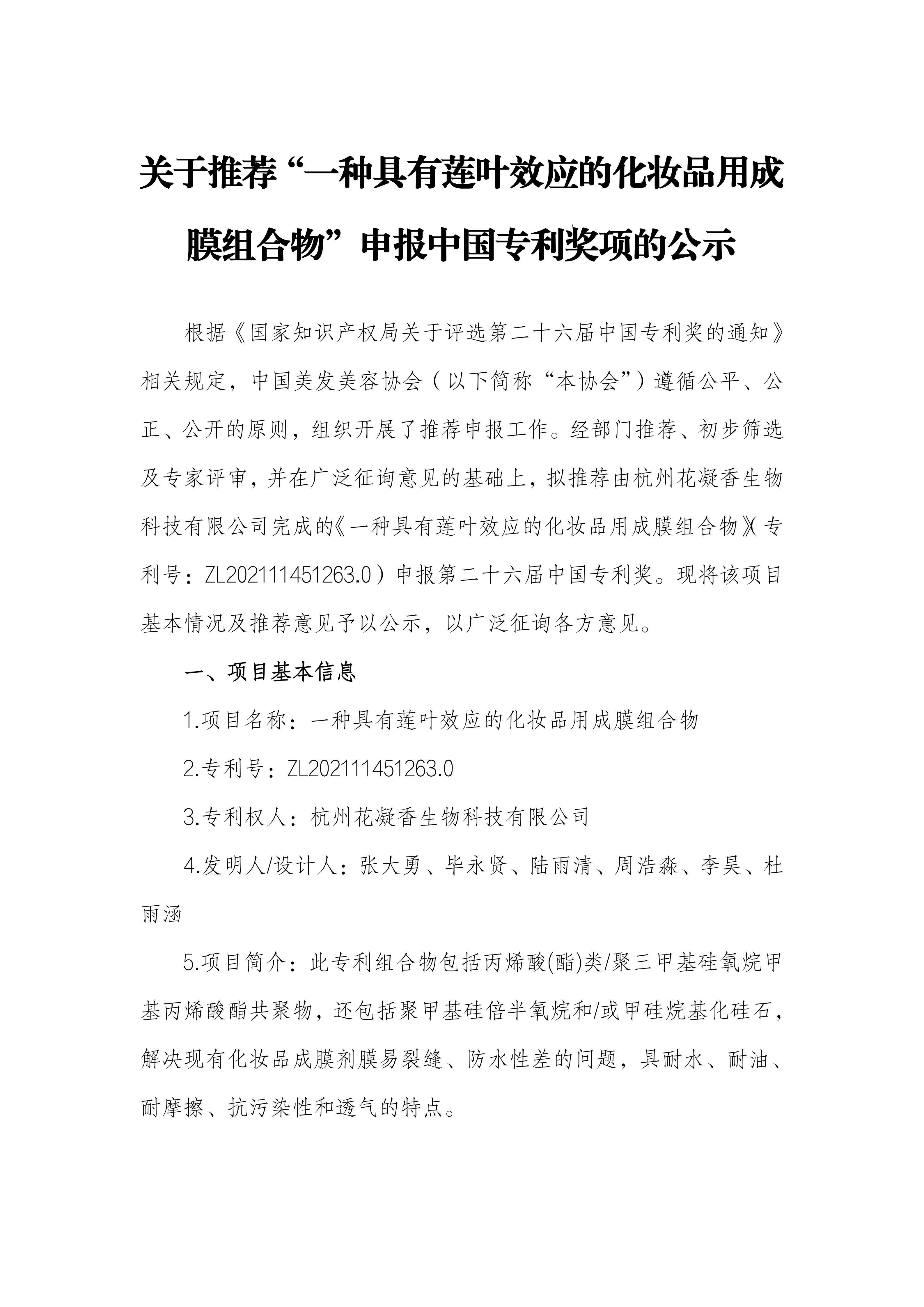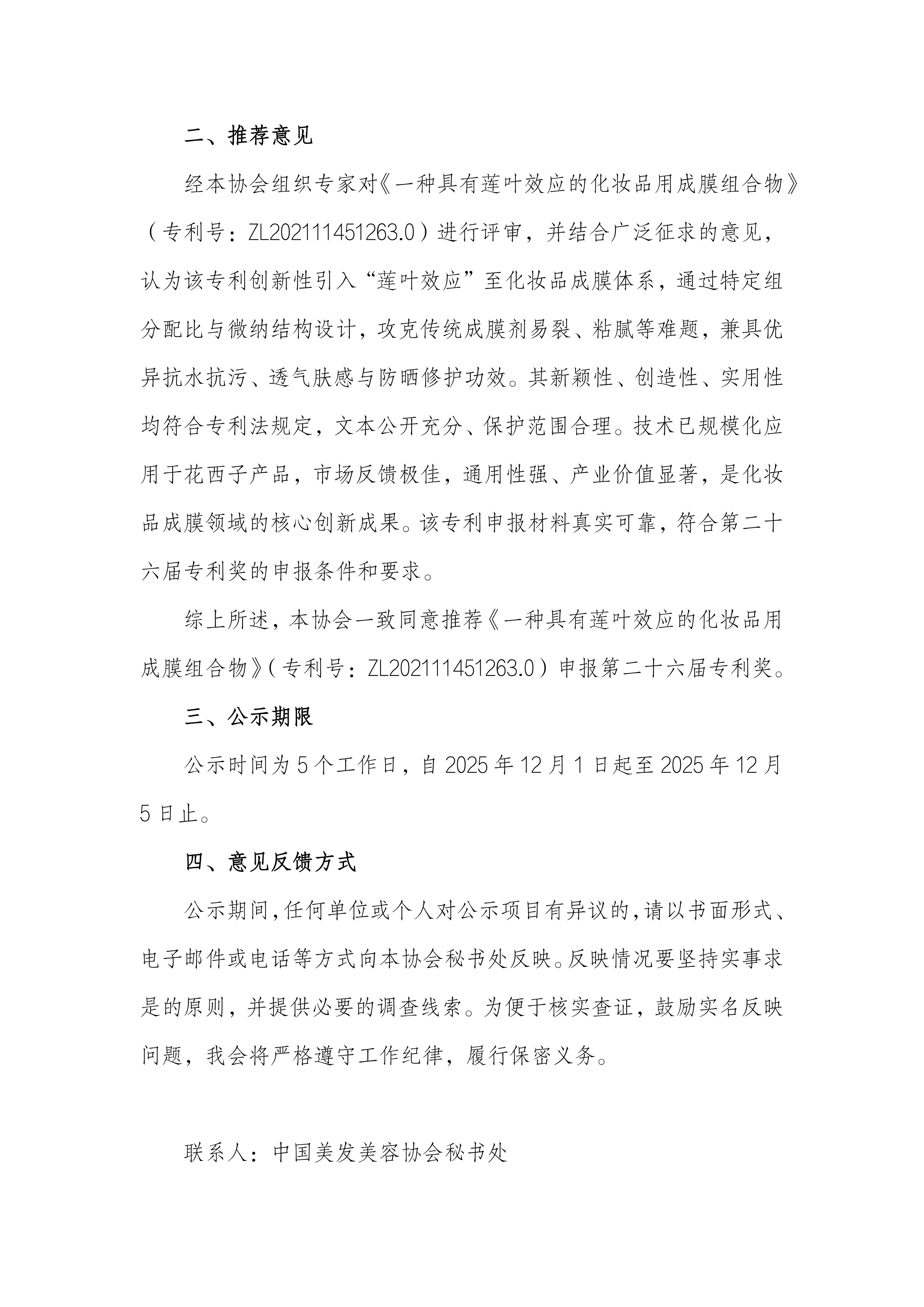 关于推荐“一种虾青素纳米乳制剂及其制备方法”申报中国专利奖项的公示